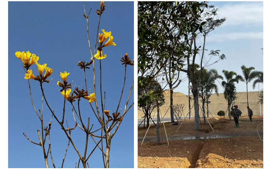 2023年3月12日,東粵環(huán)保的生產(chǎn)區(qū)域煥然一新。生產(chǎn)樓大門(mén)前的狐尾椰子樹(shù),搖曳生姿,獨(dú)領(lǐng)風(fēng)騷;一旁的桂花樹(shù),沉靜內(nèi)斂,毫不遜色;與其相陪襯的還有灰莉球、黃金葉球等,象征著樸素自然、清潔純凈。最引人矚目的莫過(guò)于黃花風(fēng)鈴木,黃色的花蕾映照綠樹(shù)婆娑的身影,更顯生機(jī)活力,象征感恩的寓意。