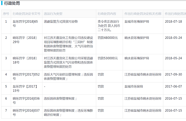 經(jīng)啟信寶查詢,2018年5月24日,天嘉宜化工被響水縣環(huán)境保護(hù)局處罰,[響環(huán)罰字〔2018〕29號(hào)]決定文書介紹,依據(jù)《建設(shè)項(xiàng)目環(huán)境保護(hù)管理?xiàng)l例》第二十三條、《中華人民共和國(guó)環(huán)境影響評(píng)價(jià)法》第三十一條、《中華人民共和國(guó)大氣污染防治法》第一百零七條、《中華人民共和國(guó)固體廢物污染環(huán)境防治法》第七十五條,天嘉宜化工被罰款480000元。最近的一次是2018年7月18日,因逃避監(jiān)管方式排放污染物,被鹽城市環(huán)境保護(hù)局責(zé)令改正違法行為,并處罰款人民幣20萬元。