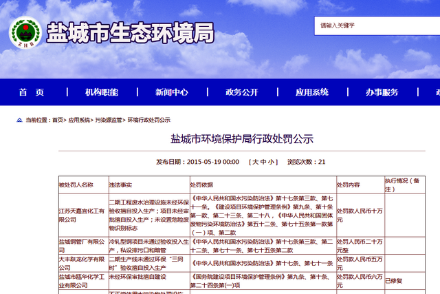 鹽城市環(huán)境保護(hù)局2015年5月19日公布的行政處罰公示顯示,江蘇天嘉宜化工有限公司二期工程廢水治理設(shè)施未經(jīng)環(huán)保驗(yàn)收擅自投入生產(chǎn);未設(shè)置危險(xiǎn)廢物識(shí)別標(biāo)志,處罰款人民幣10萬元。